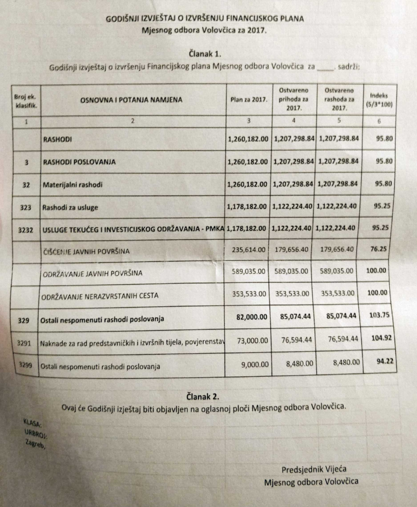 Jedna od točki na sjednici bila je izglasavanje Financijskog izvještaja za MO Volovčica za 2017. Ono što sam naglasio u Vijeću i s čime se nekoliko vijećnika/ca složilo je da Financijski izvještaj nema nikakve specifikacije troškova. Primjerice, jedine informacije su iznos planiran za potrošnju i iznos koji je ostvaren. Mjesni odbor nema mogućnost provjere je li primjerice Zrinjevac održavao javne površine u skladu s iznosom koji im je dodijeljen za 2017. Na kraju sam podržao Zaključak o usvajanju Financijskog izvještaja na način da zaključak utvrđuje potrebu specifikacije troškova. Tako će se barem negdje zabilježiti netransparentnost mjesne samouprave i zahtjev mjesnog odbora za više transparentnosti. (Kompletan Godišnji izvještaj o izvršenju financijskog plana za Volovčicu, za 2017. nalazi se na dnu izvještaja. Procijenite sami koliko je detaljan).